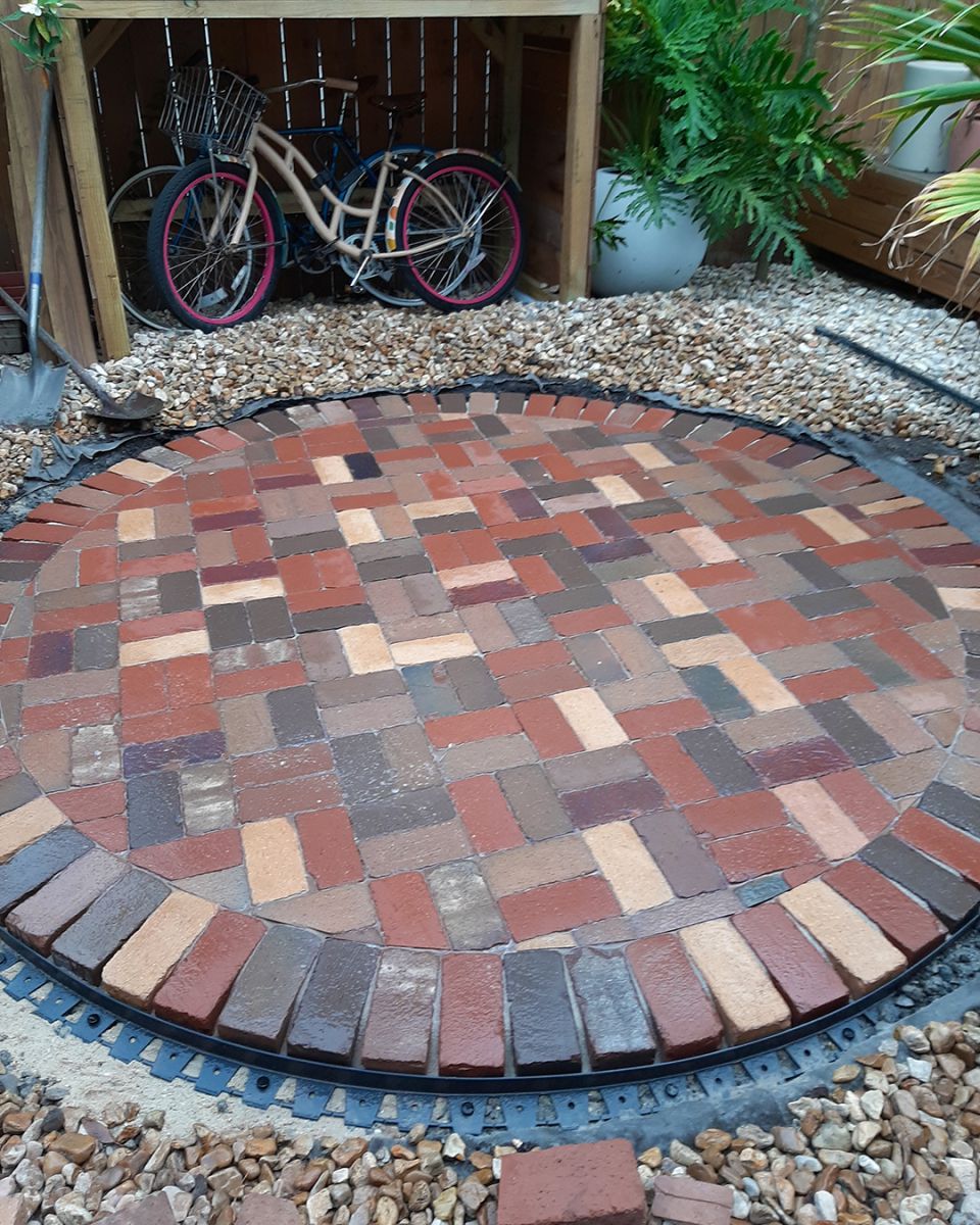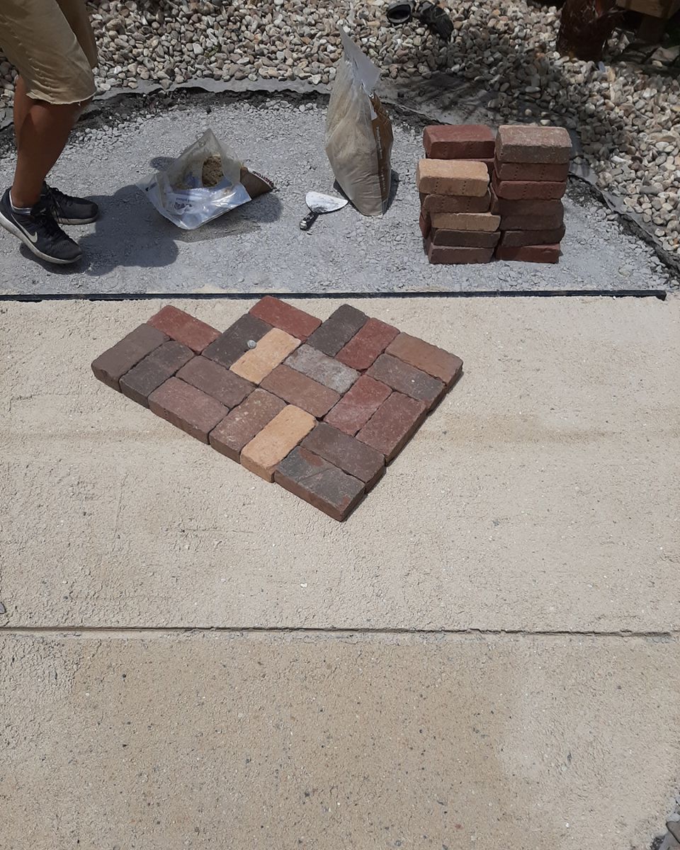 - Brick pavers — these are solid bricks (no holes), typically 4" x 8". Pick a pattern you like; there are a dozen options from classic running bond to fancy herringbone.