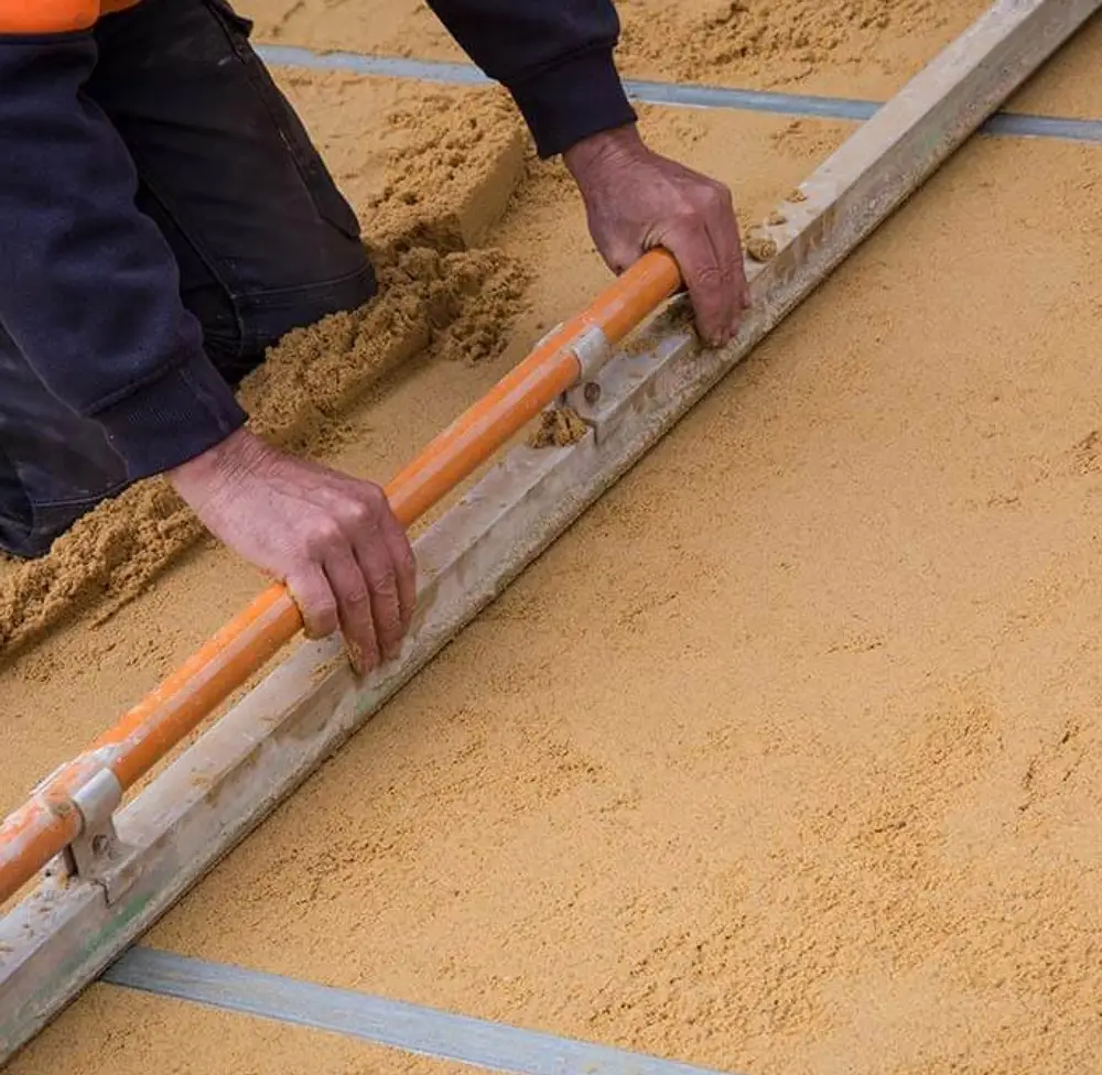 Lay 1"-diameter pipes or wood strips along the edges of your work area as rails. Fill in the area with sand (a light mist of water beforehand helps eliminate air pockets), then drag your screed board across the rails to create a perfectly uniform 1" depth of sand.
