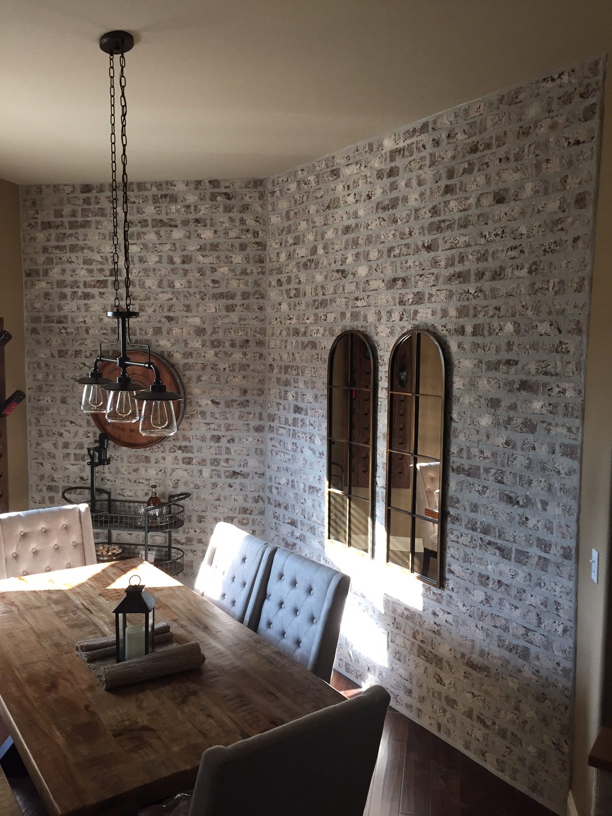 Distressed red brick with a heavy cream limewash finish for a vintage, handcrafted aesthetic.